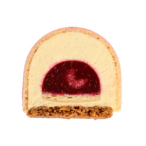 Crème légère vanille de Madagascar, biscuit amande, croustillant aux amandes effilées grillées, compotée de framboises.