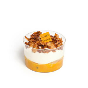 Mousse au chocolat blanc ivoire, crémeux passion avec ses dés de mangues et biscuit coco.